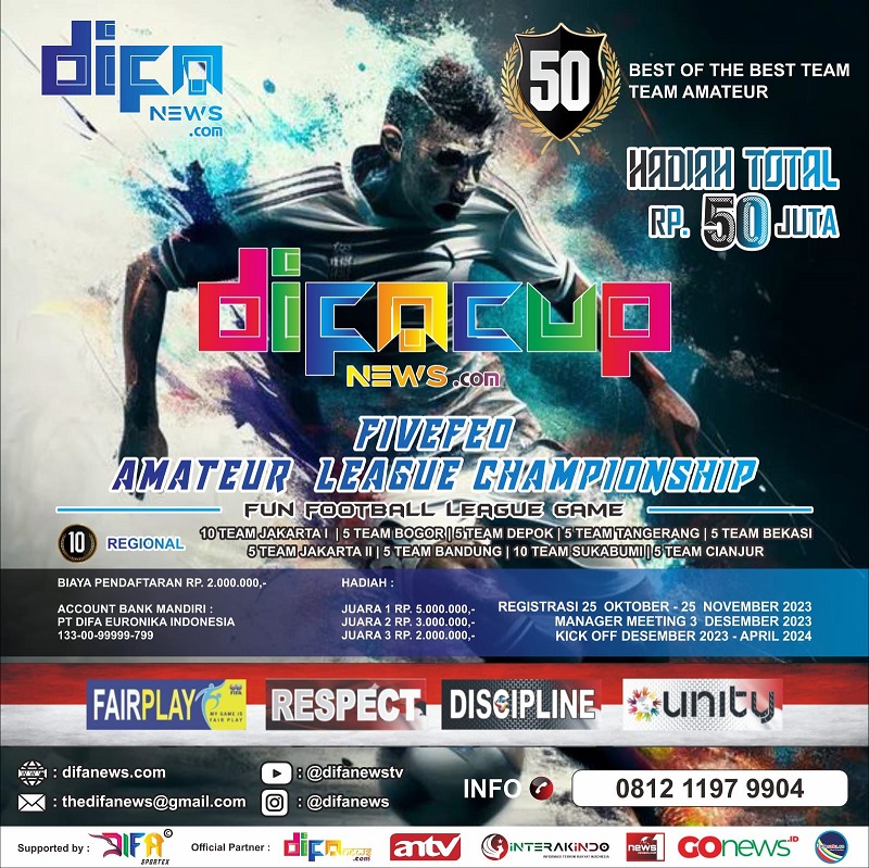 JAKARTA, newsatu.com: Kompetisi sepakbola amatir FiveFeo Difa Cup 2023 akan digelar mulai Desember 2023 hingga April 2024. Turnamen ditargetkan diikuti oleh paling sedikit 50 tim.