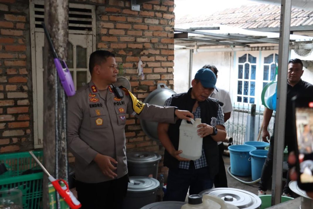 GEREBEK : Kapolres Prabumulih, AKBP Endro Aribowo SIk bersama Kasat Reskrim, AKP Herli Setiawan SH MH memimpin pengerebekan pabrik ciu di Klenteng Kelurahan Tugu Kecil, Kecamatan Prabumulih Timur, Rabu. Foto : Ist/NEWSATU.COM