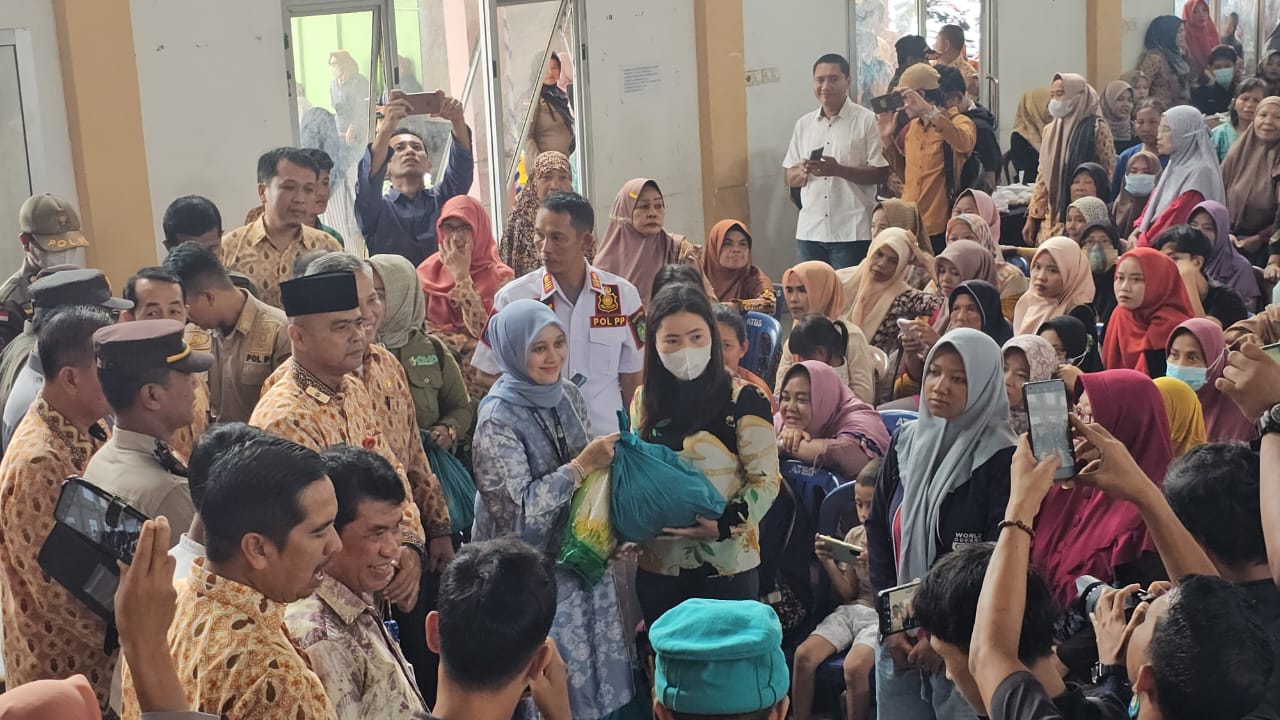 PASAR : Pj Sekda Prabumulih, Drs Aris Priadi SH MSi menyerahkan secara simbolis pembelian sembako murah di program Pasar Murah Pangan Murah kolaborasi Disprindag dan DKP serta Pengadaan di Gedung Serba Guna Kelurahan Tanjung Raman, Kamis. Foto : Rian/NEWSATU.COM