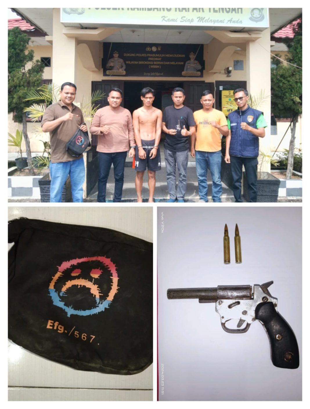 SENPI : Tim Macan Polsek RKT pimpinan Aipda M Agustino SH meringkus Widi Prabujaya, 21 tahun terjaring patroli membawa senpi, Sabtu. Foto : Ist/NEWSATU.COM