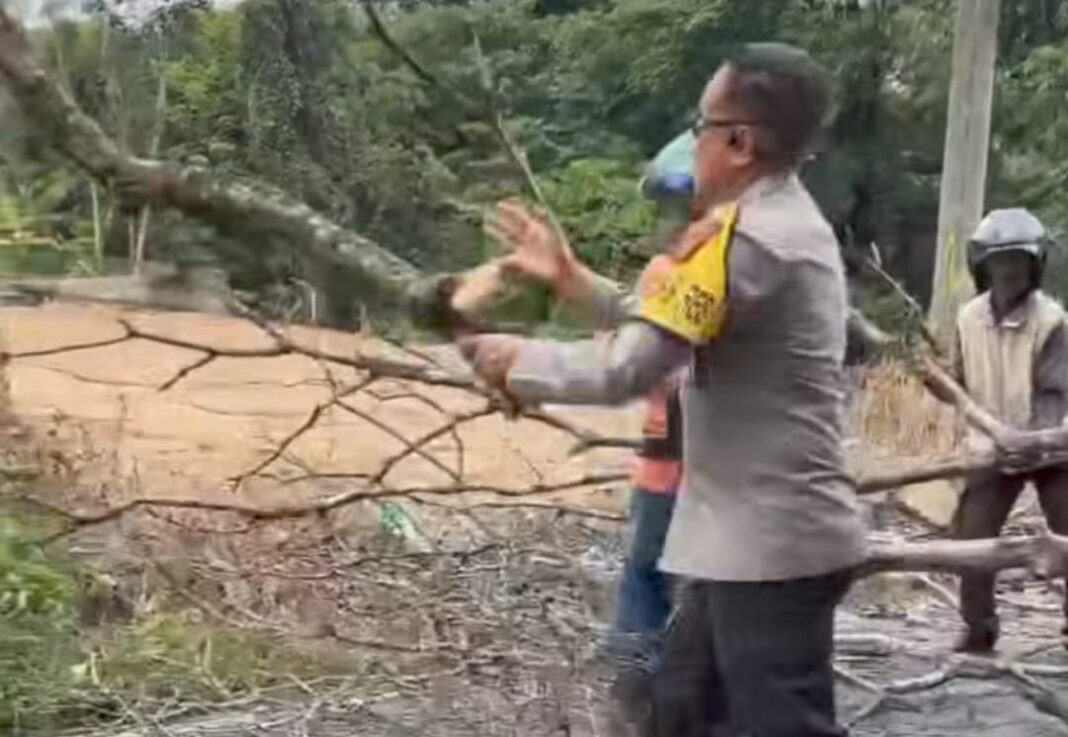 BERSIHKAN : Wakapolres Prabumulih, Kompol Eryadi Yuswanto SH MH membersihkan pohon tumbang bersama warga di Jalan Dusun Gunung Ibul ketika tidak sengaja melintas, Senin. Foto : Ist/NEWSATU