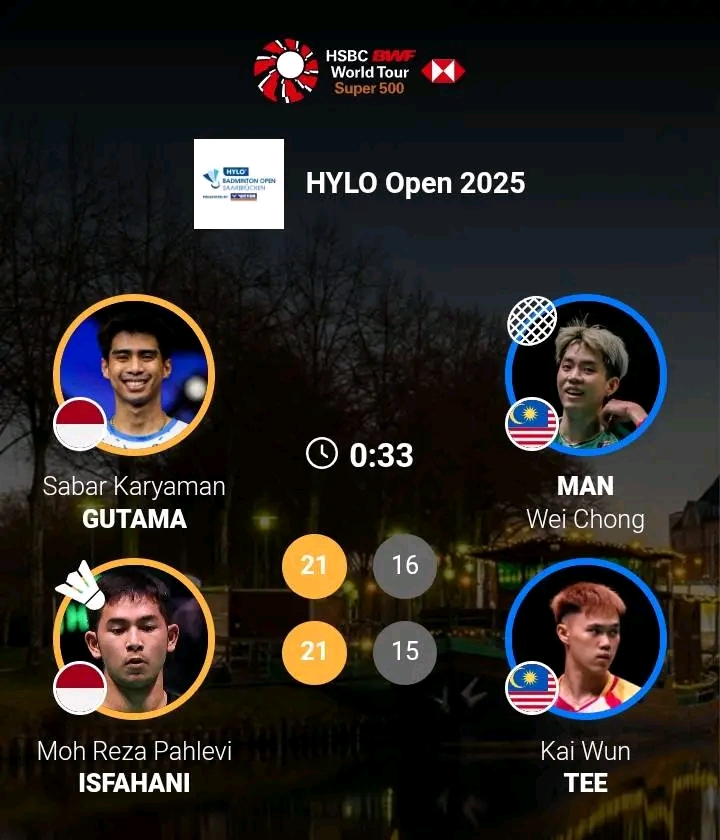 NEWSATU — Pasangan ganda putra Indonesia, Sabar Karyaman Gutama/Moh Reza Pahlevi Isfahani, memastikan langkah mereka ke final Hylo Open 2025 setelah tampil impresif di semifinal. Duet Merah Putih ini menumbangkan wakil Malaysia, Man Wei Chong/Kai Wun Tee, dengan skor meyakinkan 21–16, 21–15 di Saarbrücken, Jerman, Sabtu (1/11) malam waktu setempat.
