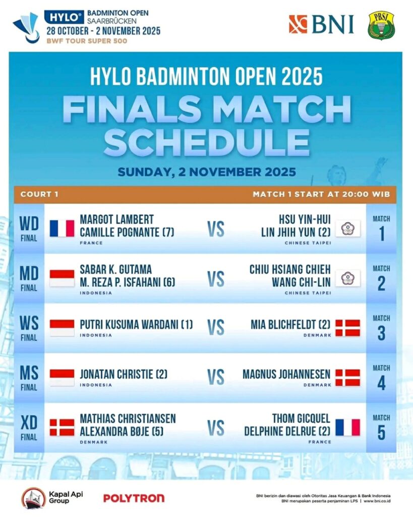 Ketiga wakil Indonesia itu adalah Sabar Karyaman Gutama/Moh Reza Pahlevi Isfahani (ganda putra), Putri Kusuma Wardani (tunggal putri), dan Jonatan Christie (tunggal putra). Laga final dijadwalkan berlangsung Minggu, 2 November 2025 mulai pukul 20.00 WIB, disiarkan langsung di TVRI Sport dan Vidio.