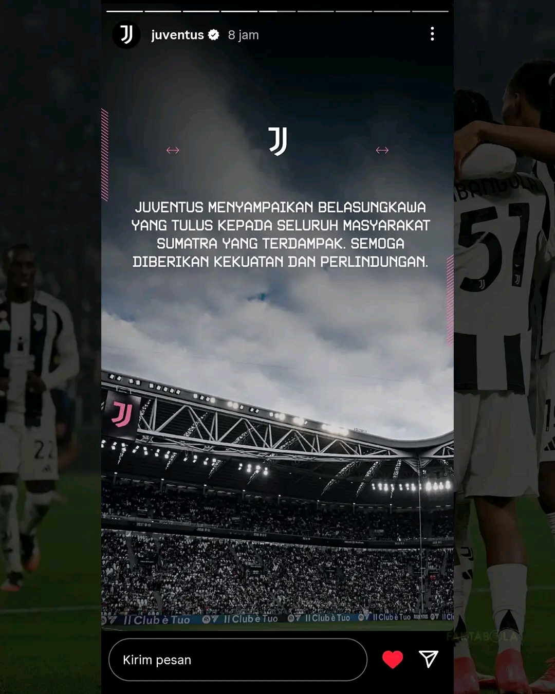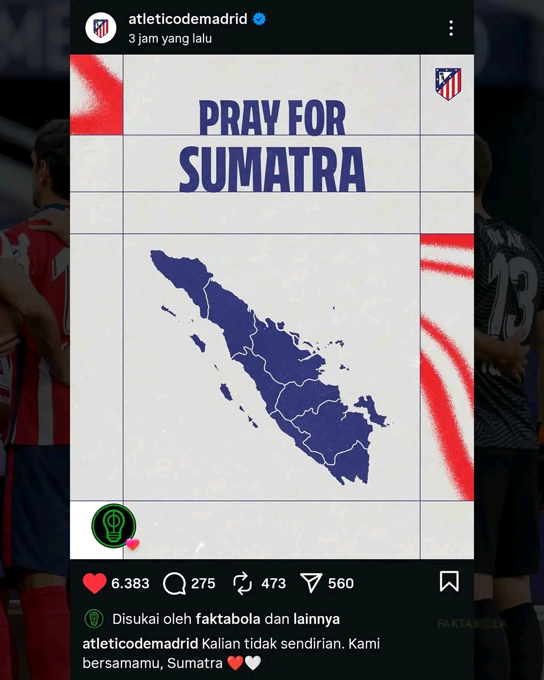 Dari Italia, Juventus menyampaikan belasungkawa yang tulus kepada seluruh warga terdampak. Sementara Atletico Madrid menampilkan peta Sumatra dengan pesan singkat namun kuat: Pray for Sumatra.