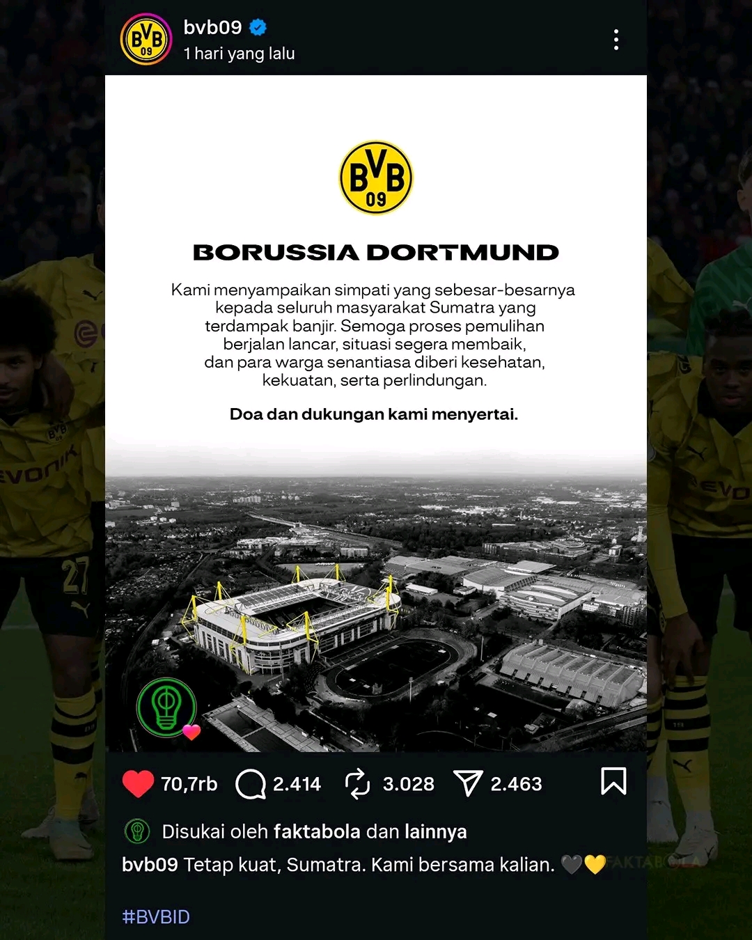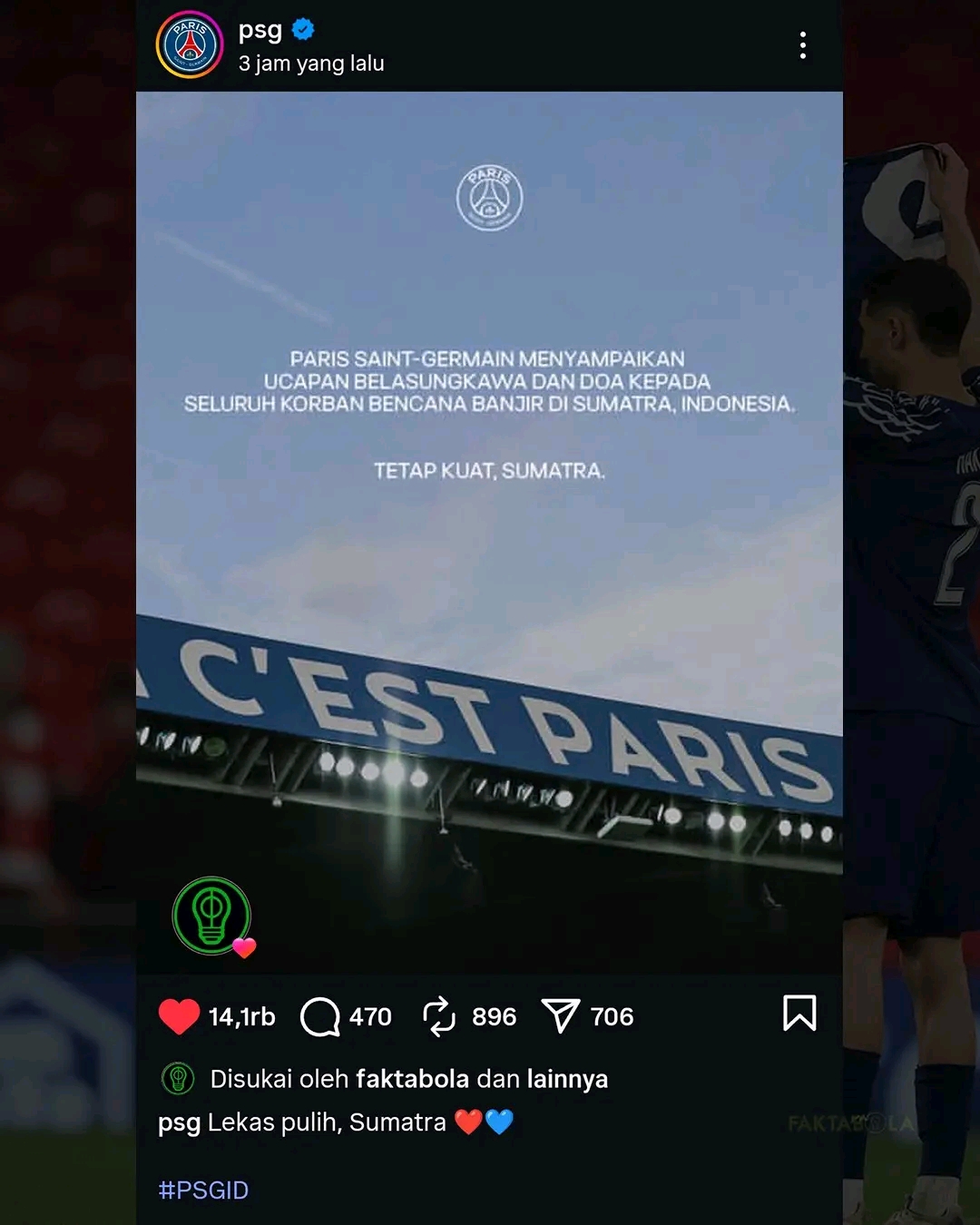Tak lama berselang, Borussia Dortmund ikut menyampaikan simpati mendalam dan berharap proses pemulihan di Sumatra dapat berjalan dengan lancar. PSG pun mengirim pesan serupa, menuliskan “Tetap kuat, Sumatra” di dalam unggahan bernuansa biru khas Paris.