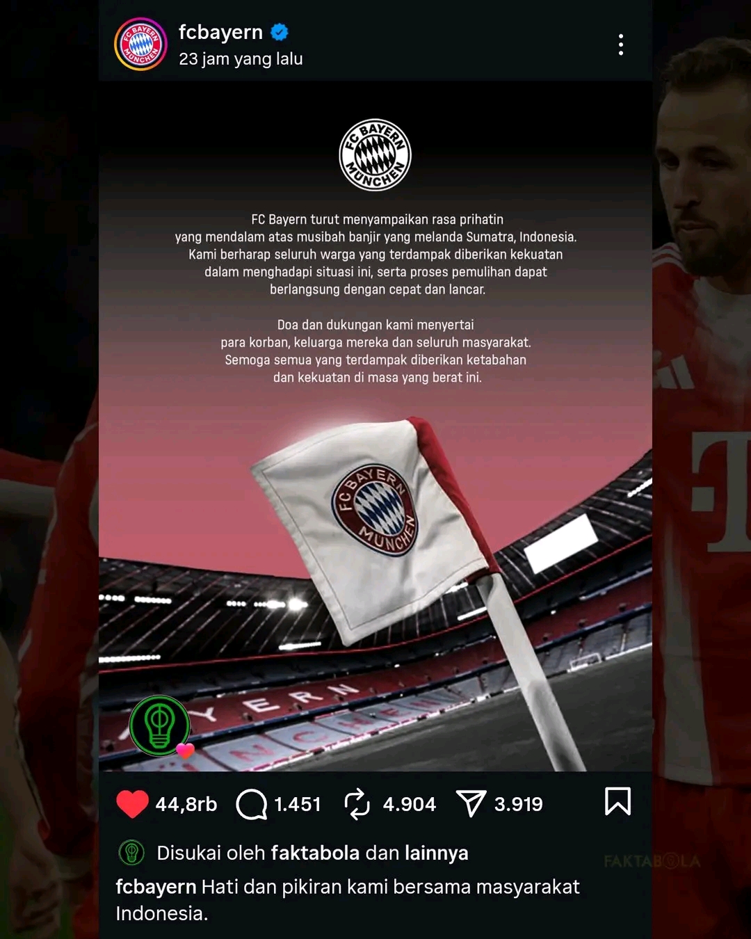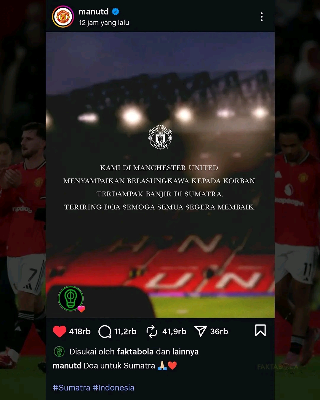 Red devil’s julukan klub Manchester United menjadi salah satu yang paling awal mengucap. Dalam unggahan bernuansa gelap dan tenang, United menuliskan doa agar seluruh korban terdampak “segera membaik dan diberikan kekuatan.” Postingan itu langsung mendapat ratusan ribu interaksi dari para penggemar.