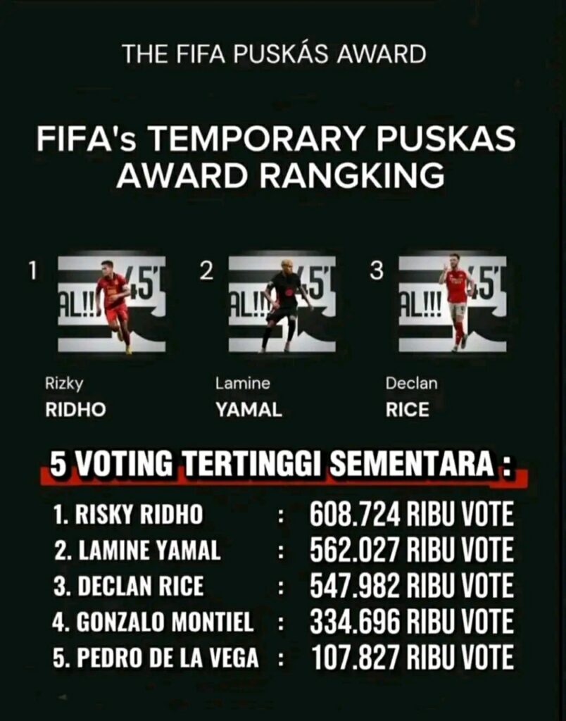 NEWSATU – Bek Timnas Indonesia Rizky Ridho, kembali jadi sorotan dunia. Setelah golnya resmi masuk nominasi FIFA Puskás Award 2025, kini Ridho juga berada di puncak voting sementara, mengungguli dua bintang besar: Lamine Yamal (Barcelona) dan Declan Rice (Arsenal).