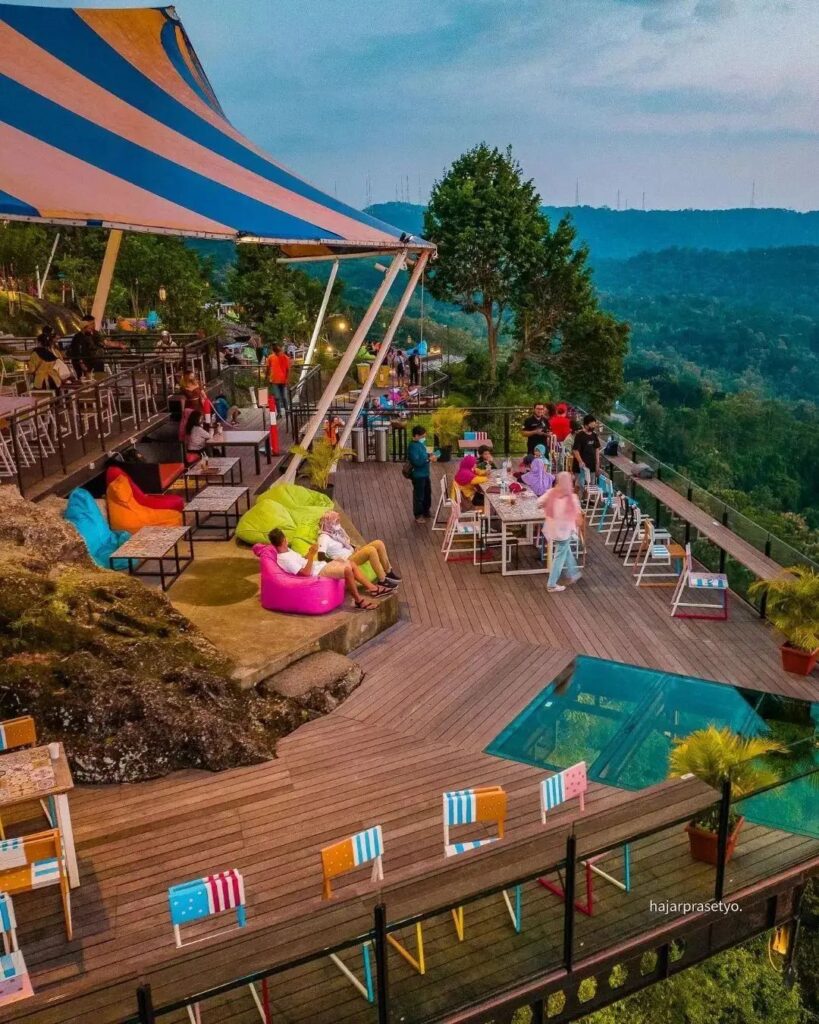 Obelix Hills terkenal dengan sunset-nya yang dramatis. Tiket masuk sekitar Rp20.000–Rp25.000, sementara spot foto premium ada biaya tambahan opsional. Tempatnya luas, banyak bean bag dan area chill yang bikin nongkrong sore makin asik. Cocok buat lo yang cari tempat santai dengan pemandangan bukit.